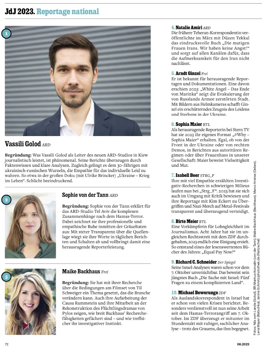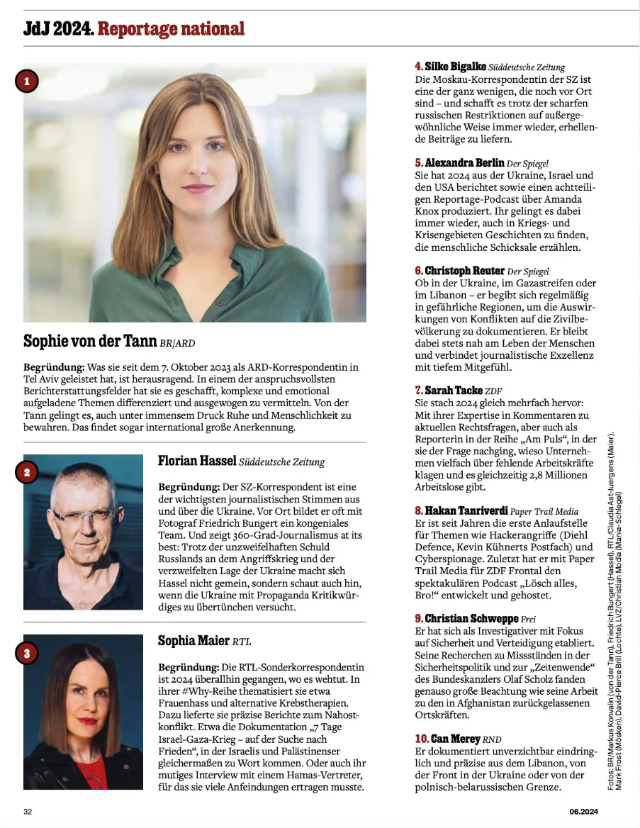​​“In der Kategorie ‚Universal Empowerment‘ wurde der Beitrag ‚Kampf gegen den Frauenhass‘ ausgezeichnet. Sophia Maier beleuchtet in ihrer RTL-Reportage das Ausmaß von Hass und Hetze, dem insbesondere Frauen mit Migrationsgeschichte im öffentlichen Raum ausgesetzt sind. Im Mittelpunkt steht Politikerin Sawsan Chebli, die eindrücklich von ihren persönlichen Erfahrungen mit digitalem und physischem Frauenhass berichtet.“